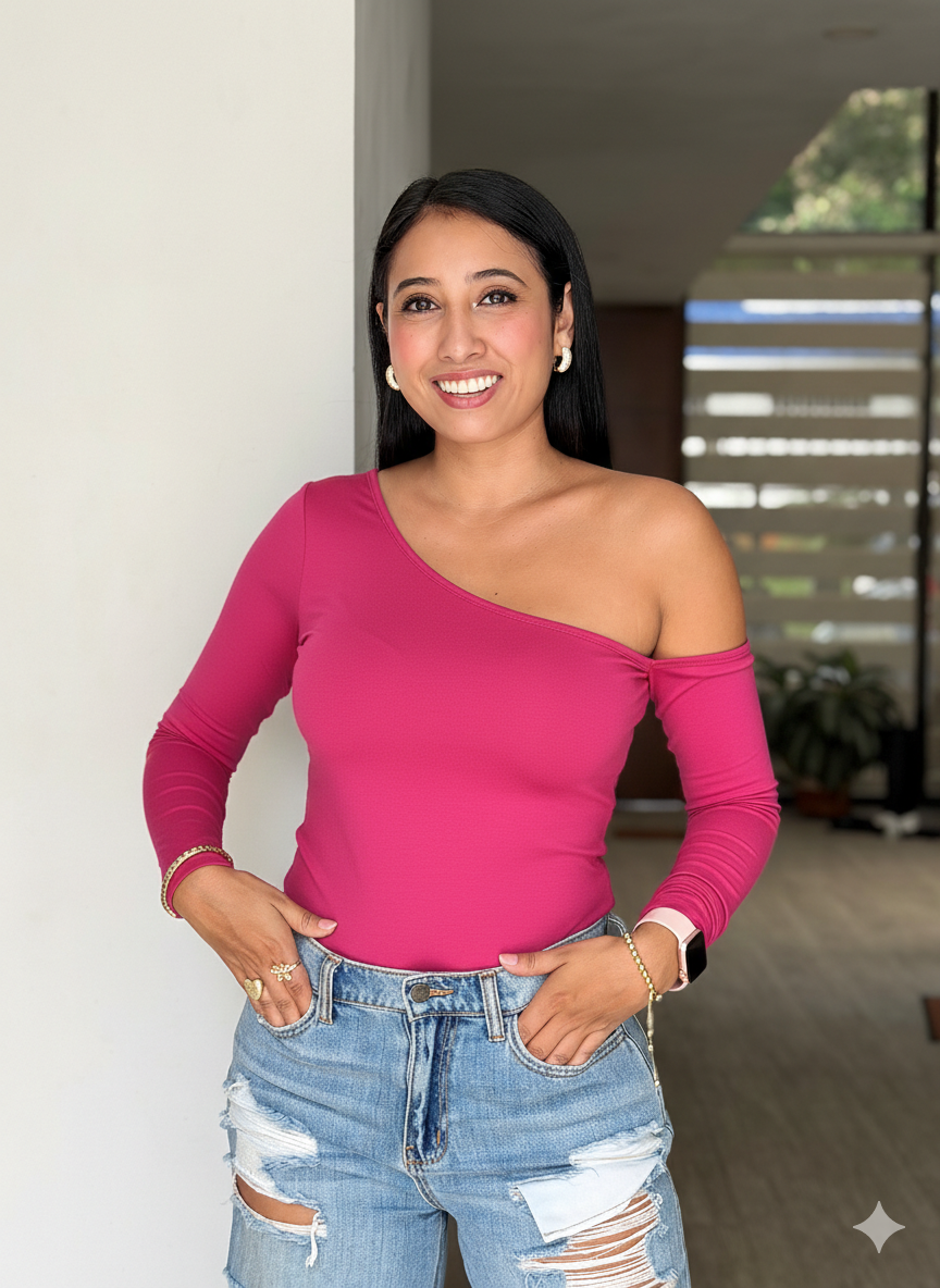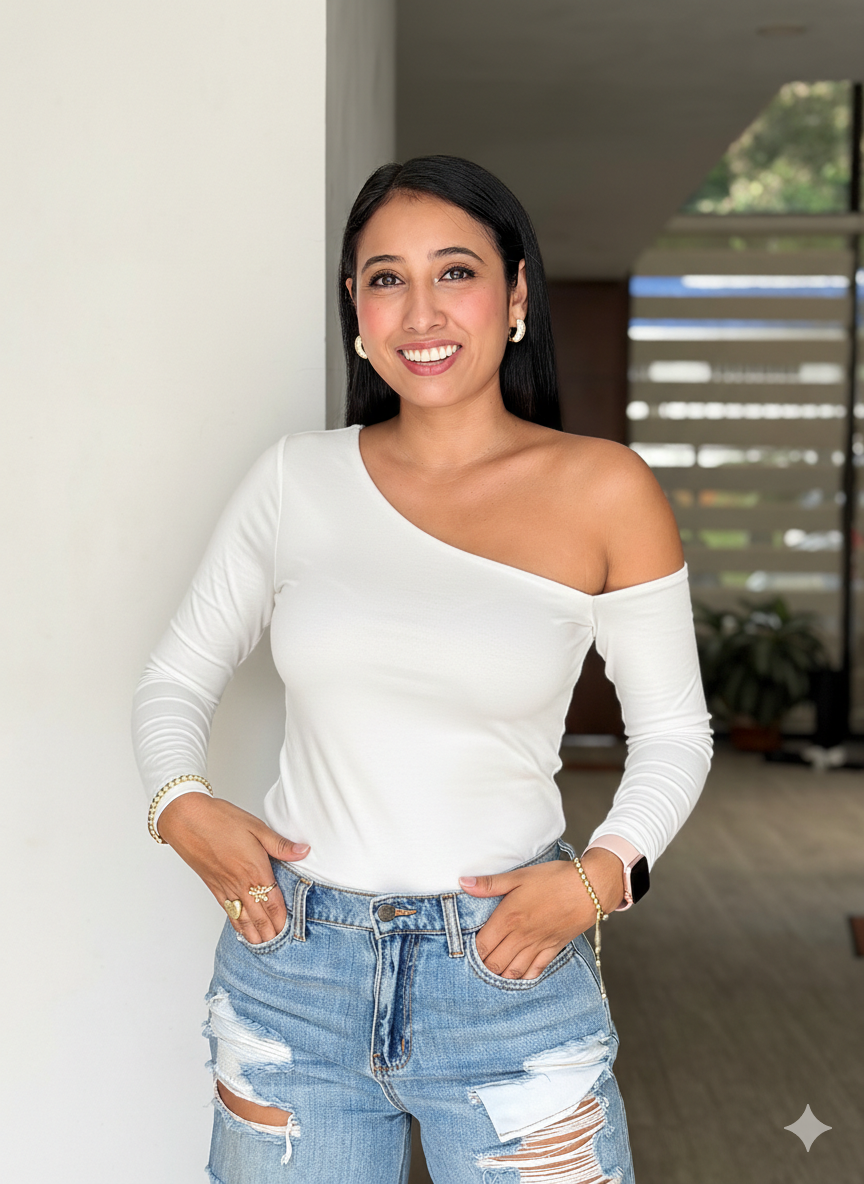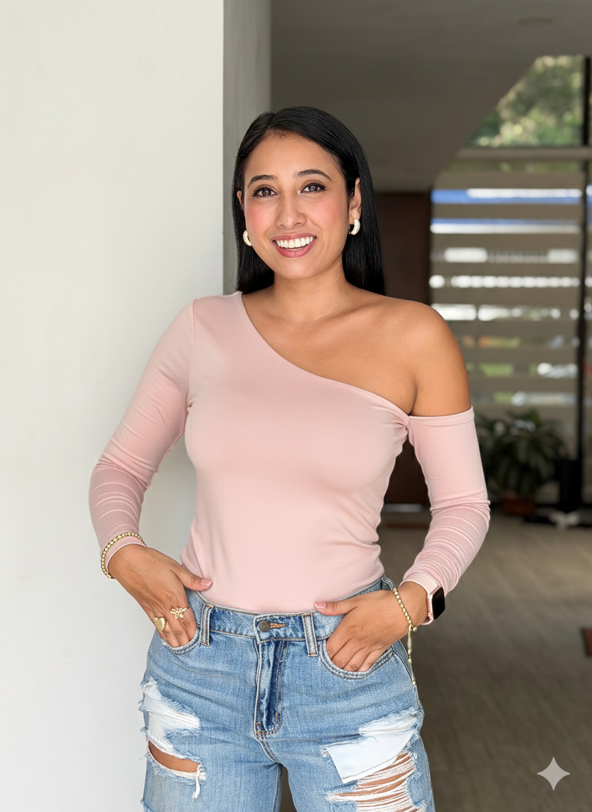 Su corte asimétrico y el moño ajustable en el hombro la hacen ver súper femenina y delicada, sin perder esa esencia sencilla que tanto amamos.