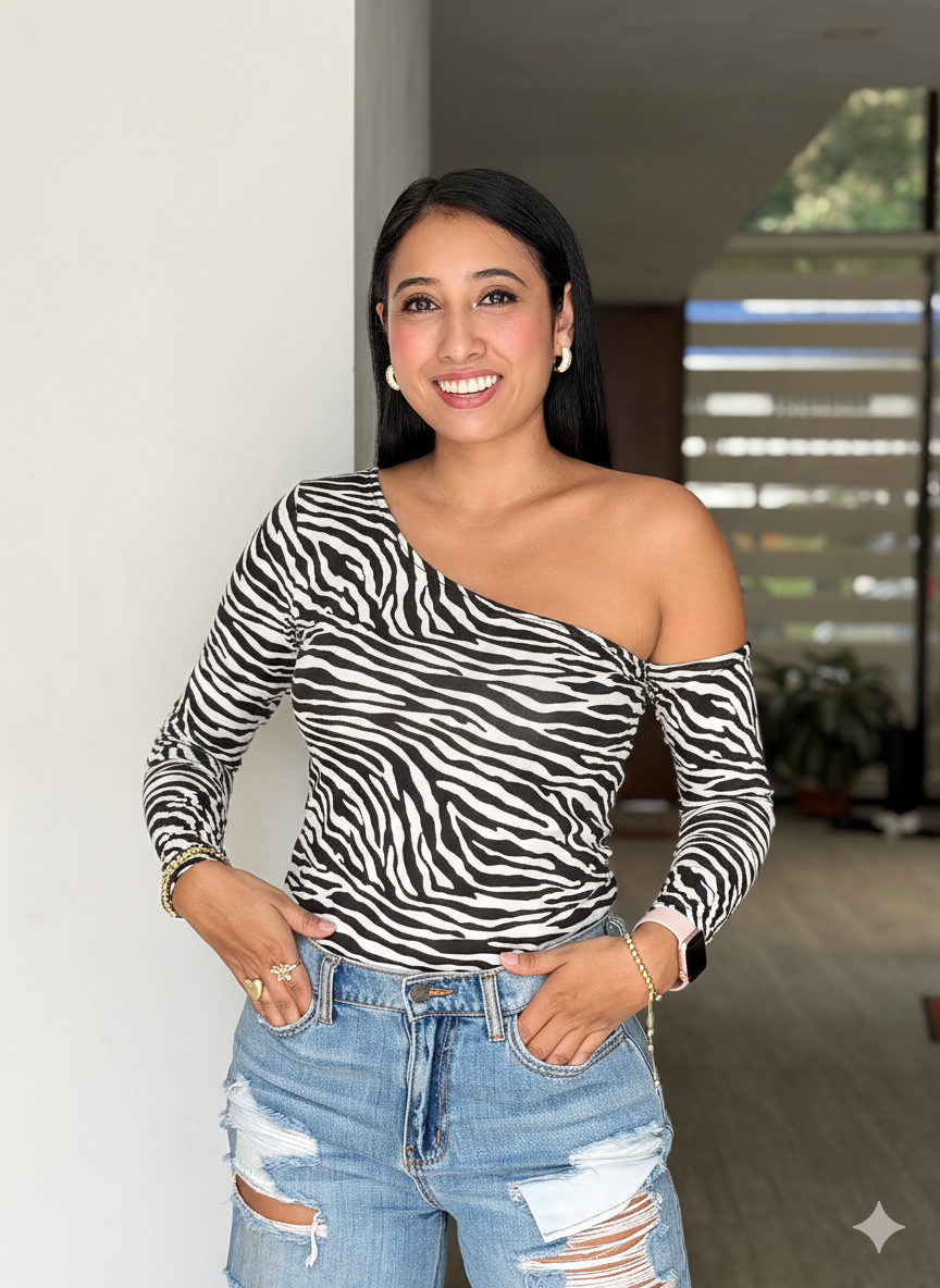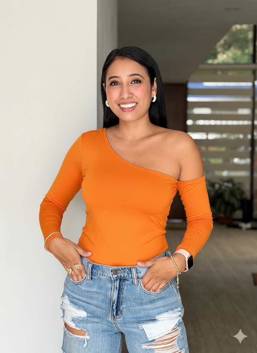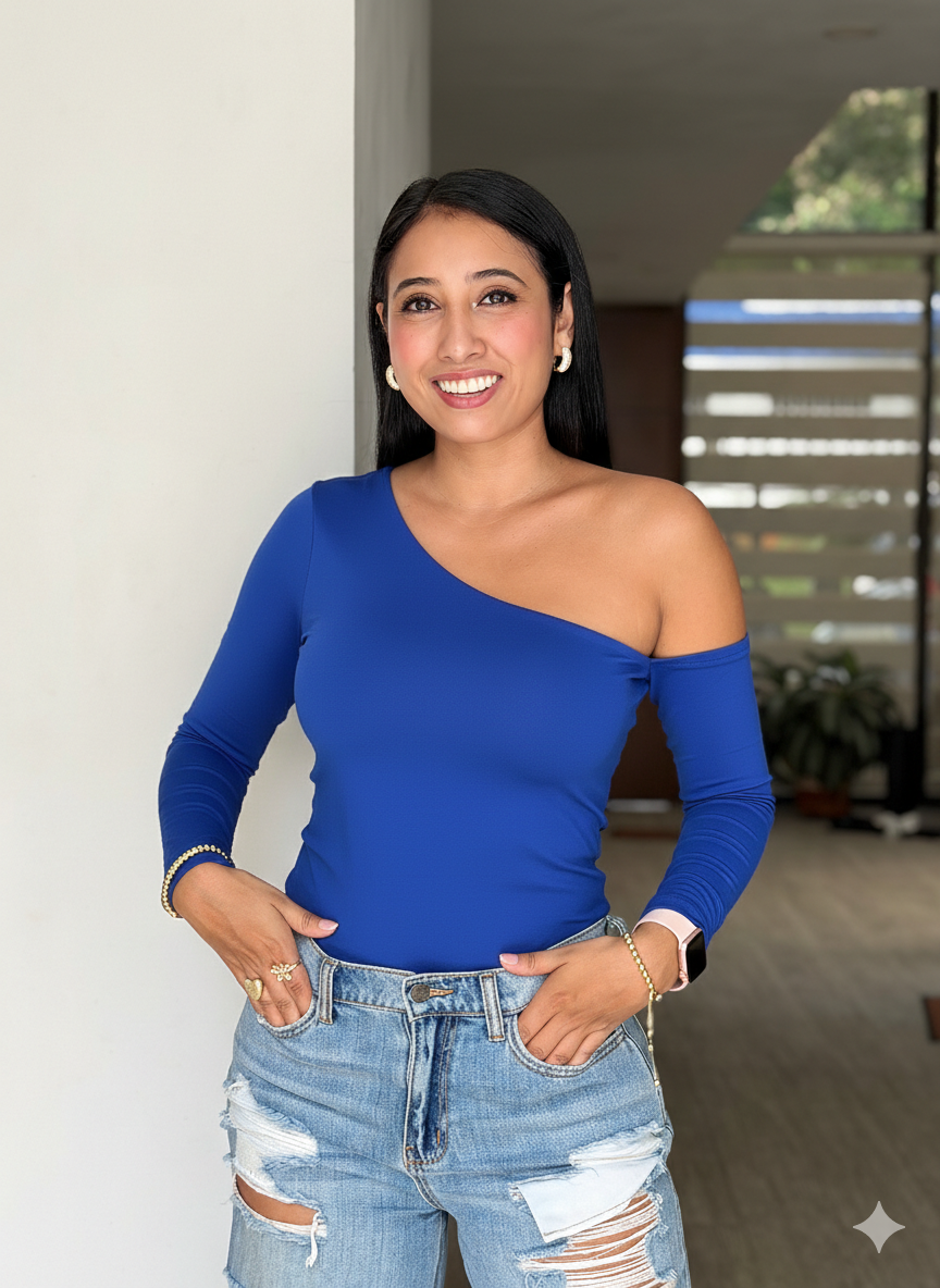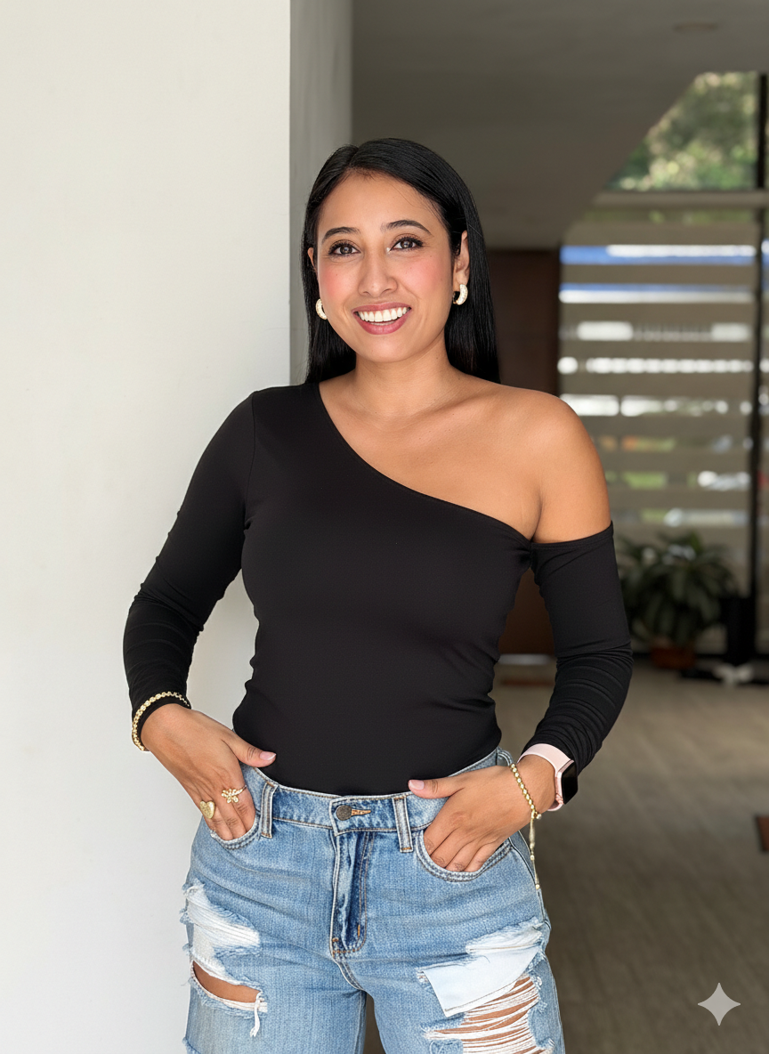 Su corte asimétrico y el moño ajustable en el hombro la hacen ver súper femenina y delicada, sin perder esa esencia sencilla que tanto amamos.