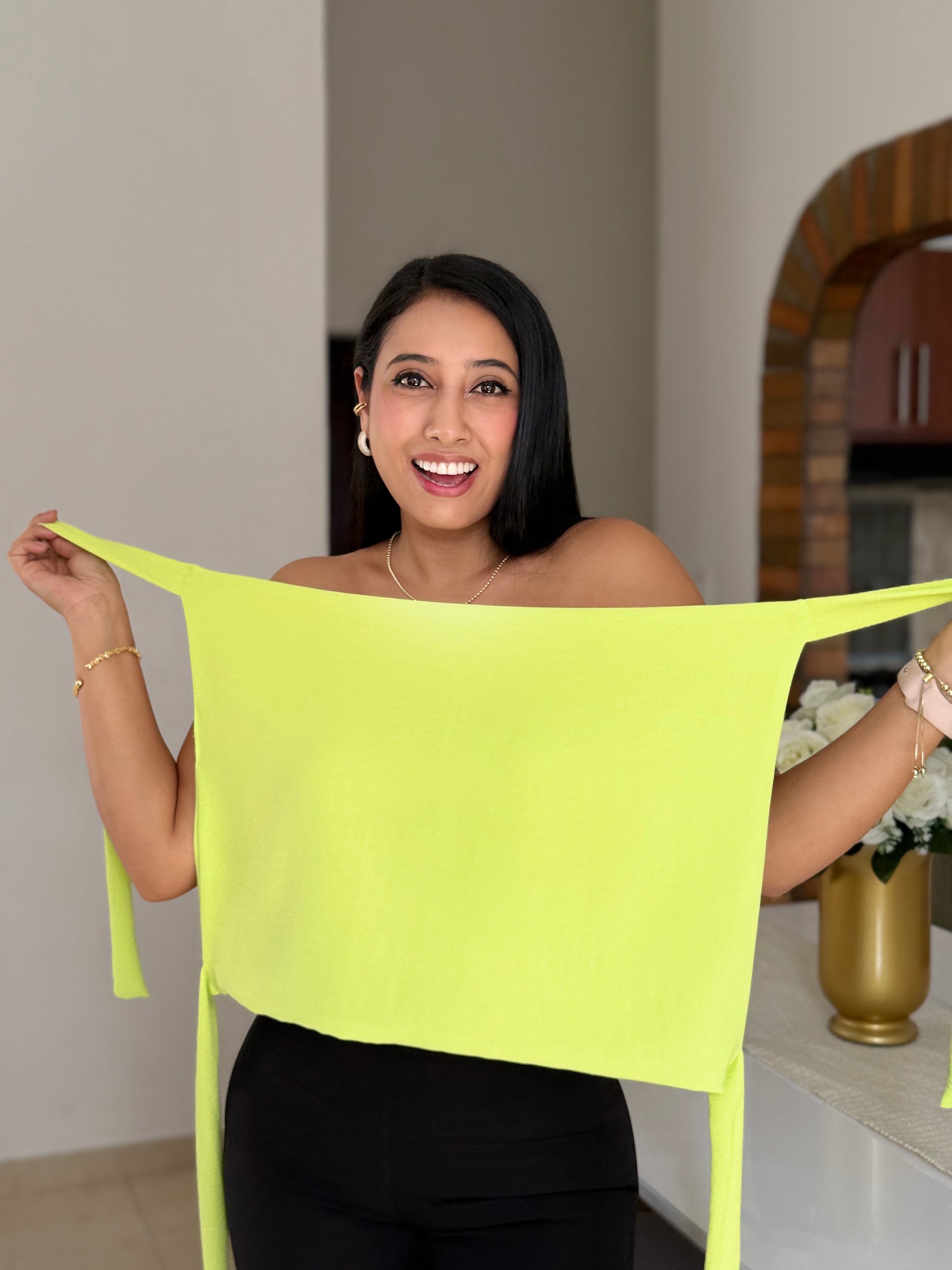 Una pieza ultra versátil diseñada para adaptarse a ti. Su estructura tipo pañoleta permite crear seis o más estilos diferentes, simplemente anudándola y ajustándola al cuerpo según tu gusto. Sirve para tallas xs, s o m.