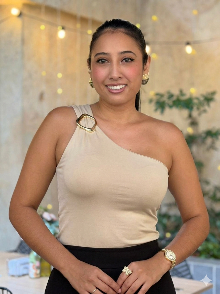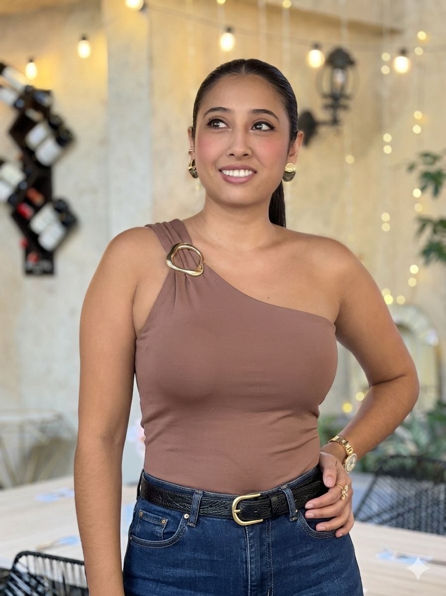 Su escote medio beso 🤍 resalta el cuello con un toque femenino y sofisticado, con un herraje fijo en tono dorado ✨ eleva el look al instante.
